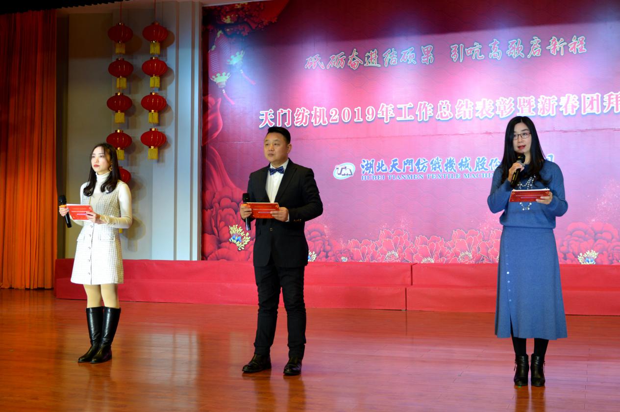 2020年1月21日下午,湖北天門(mén)紡織機(jī)械股份有限公司綜合樓多功能廳張燈結(jié)彩、暖流融融,一場(chǎng)主題為“砥礪奮進(jìn)結(jié)碩果、引吭高歌啟新程”的年度總結(jié)表彰暨新春團(tuán)拜會(huì)在這里舉行,400多名員工身著公司新佩發(fā)的西服套裝,精神奕奕地走進(jìn)會(huì)場(chǎng)。13:00整,三位主持人靚妝登場(chǎng),宣布2019年度總結(jié)表彰暨新春團(tuán)拜會(huì)開(kāi)始。