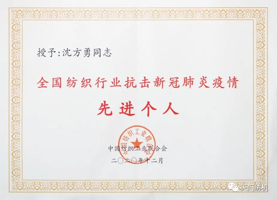 國家衛(wèi)建委、湖北省、天門市共11次檢查指導(dǎo)防疫工作,給予高度好評。國家衛(wèi)健委副主任于學(xué)軍評價天門紡機(jī)防疫有預(yù)案、有演練、有實踐,對企業(yè)抓防疫、保復(fù)產(chǎn)、促就業(yè)給予了充分肯定。9月,董事長獲評“全國紡織行業(yè)抗擊新冠肺炎疫情先進(jìn)個人”、天門市“抗擊新冠肺炎疫情先進(jìn)個人”,代表公司在疫情的大考中獲得時代新榮譽(yù)。