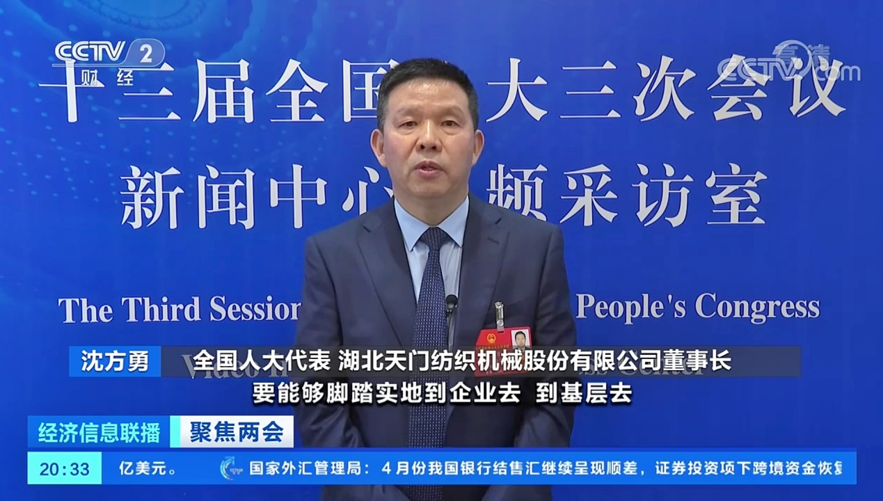 全國人大代表、湖北中小企業(yè)協(xié)會(huì)會(huì)長、湖北天門紡織機(jī)械股份有限公司董事長沈方勇在參加第十三屆全國人大三次會(huì)議期間,分別就“關(guān)于促進(jìn)棉花及紡織產(chǎn)業(yè)健康發(fā)展的再次建議”、“ 關(guān)于出臺(tái)強(qiáng)有力措施對(duì)沖疫情影響支持湖北中小企業(yè)發(fā)展的建議”、“ 關(guān)于珍惜寶貴財(cái)政金融資源在紓困惠企工作中精準(zhǔn)施策有的放矢的建議”做專題諫言。