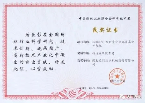 TM3817S型并條機(jī)獲評(píng)2020年度中國(guó)紡織工業(yè)聯(lián)合會(huì)“科技成果優(yōu)秀獎(jiǎng)”