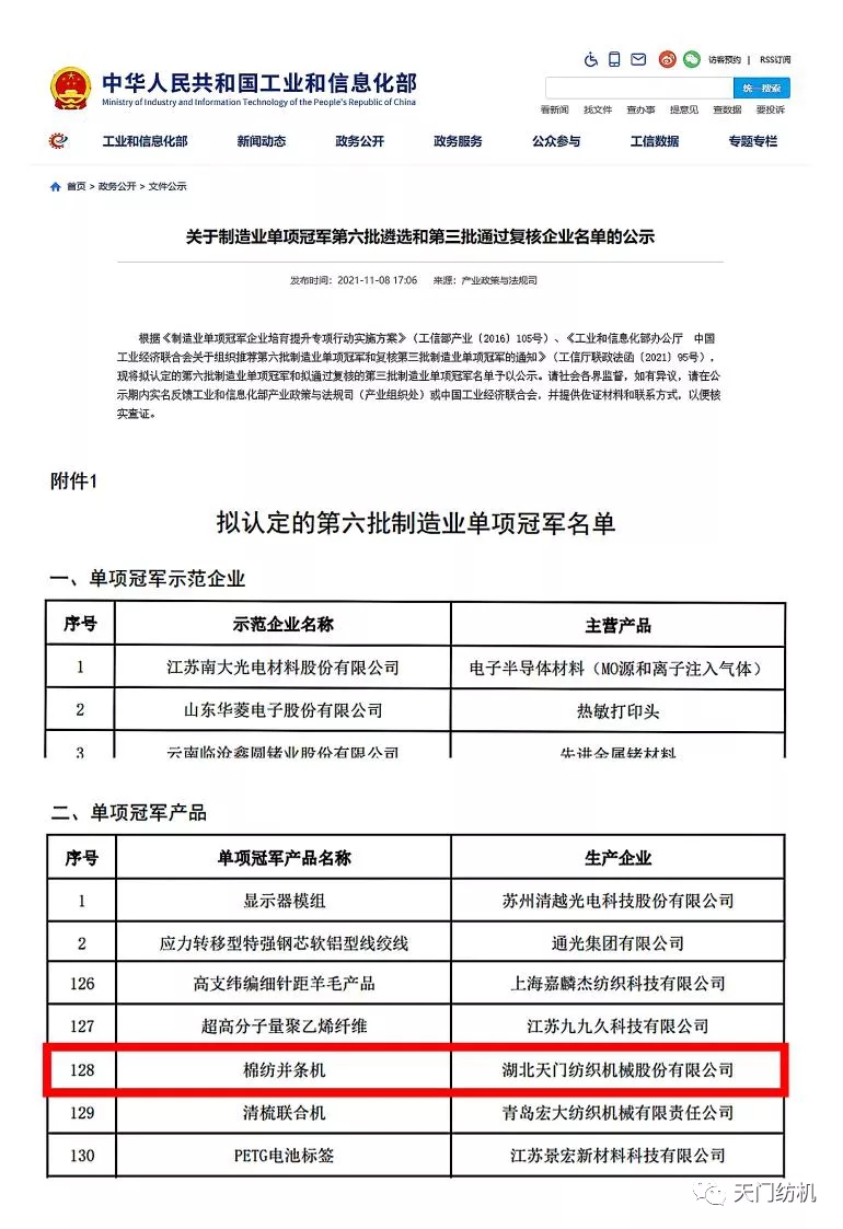 近日,國(guó)家工信部和中國(guó)工業(yè)經(jīng)濟(jì)聯(lián)合會(huì)發(fā)布通知(工信廳聯(lián)政法函〔2021〕95號(hào)),擬認(rèn)定天門紡機(jī)并條機(jī)為“單項(xiàng)冠軍產(chǎn)品”。至此,天門紡機(jī)所產(chǎn)的系列并條機(jī)成為了國(guó)內(nèi)唯一獲此殊榮的棉紡并條機(jī)。