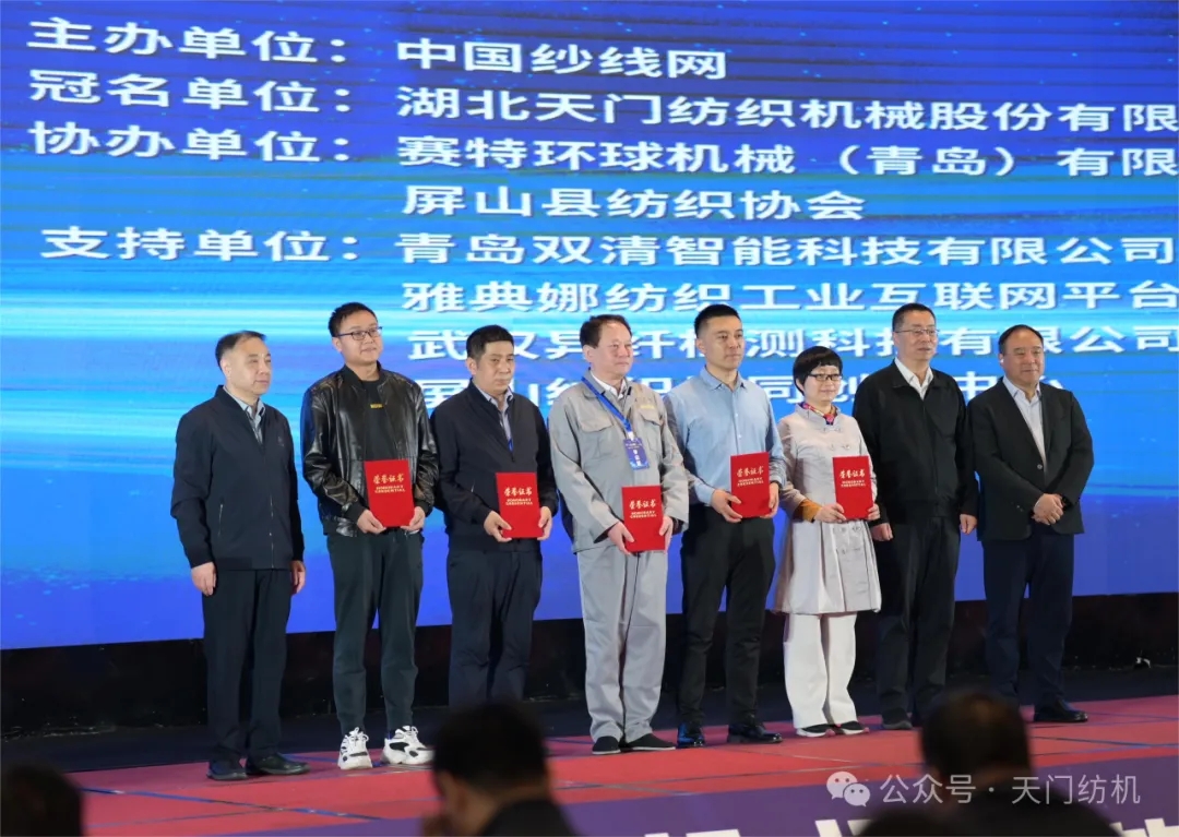 在領導和嘉賓致辭之后,舉行了“天門紡機杯”第12屆全國紡紗技術創(chuàng)新研討會論文頒獎活動。中國紡織機械協(xié)會會長顧平、中國紗線網(wǎng)總編王果剛、天門紡機總經(jīng)理焦倫進為獲獎作者頒獎。