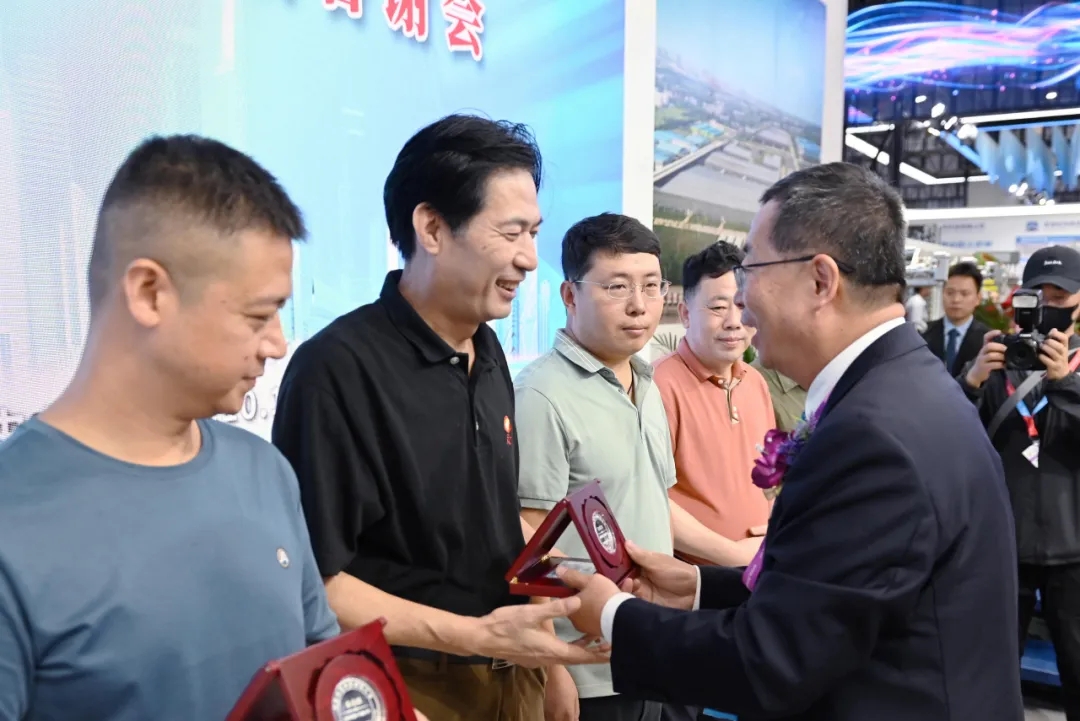 天門紡機(jī)副總經(jīng)理肖少華宣布為在并條新技術(shù)、新產(chǎn)品示范應(yīng)用上作出突出貢獻(xiàn)的華茂集團(tuán)、魏橋紡織、魯泰紡織等45家企業(yè)名單,中國棉紡織行業(yè)協(xié)會董奎勇會長為這些企業(yè)代表頒發(fā)紀(jì)念牌。