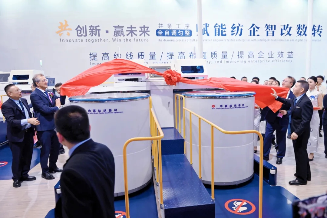 答謝會結(jié)束后,隨即舉行了新產(chǎn)品揭幕、開機(jī)儀式。天門紡機(jī)今年展出了TM23、TM27H、TM29H、TM35等四款型號的并條機(jī)。中國紡織工業(yè)聯(lián)合會孫瑞哲會長等行業(yè)領(lǐng)導(dǎo)、嘉賓一起為新產(chǎn)品揭幕,孫會長為展機(jī)啟動開機(jī)。